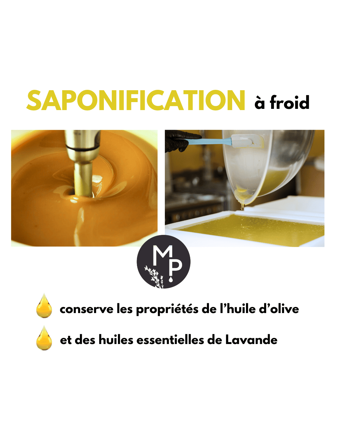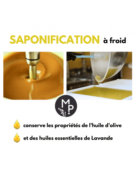 Produced by cold saponification of olive oil, this soap retains all the quality and properties of olive oil and organic essential oils of Lavender and Lavandin (produced and extracted on site at MAS).