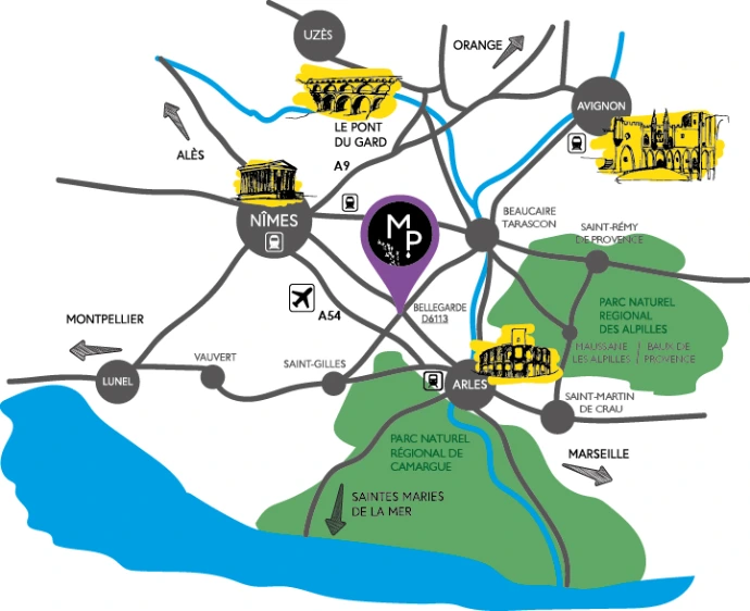 Dépasser Bellegarde en restant sur la D6113 en direction d'Arles.